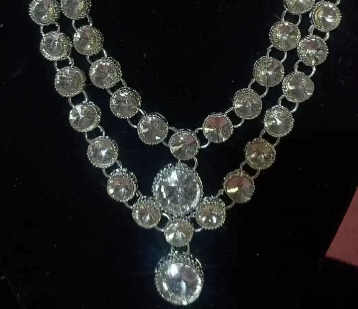 The centerpiece is the stunning necklace, designed with an elegant double-layer drape that contours beautifully to the neckline. Each layer is composed of uniformly sized, bezel-set round crystals, leading down to a magnificent V-drop focal point with larger, eye-catching stones.